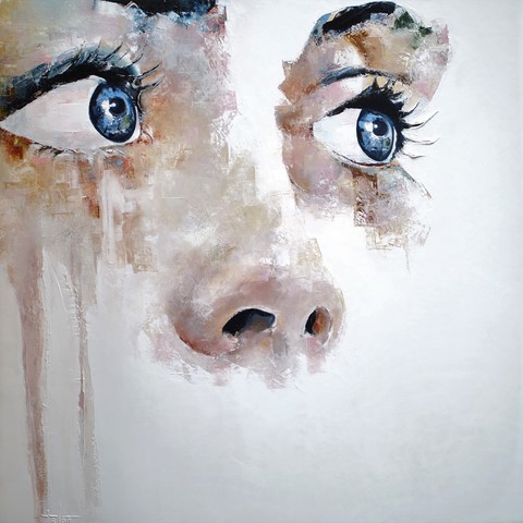 Collection privée. France. Mozaïc... C'est la deuxième toile d'une série particulière. Lorsque ma mère a été diagnostiquée Alzheimer, je n'ai pas été surpris. En revanche, ce qui m'a étonné c'est, quelques mois plus tard, de constater que le fond blanc de mes toiles s'intensifiaient, prenait de l'importance et un sens subjectif que je ne soupçonnais pas jusqu'alors. Il délitait les visages colorés pour, peu à peu, les anéantir. Comme disait le peintre Pierre Soulages "ce n'est qu'après avoir peint, que je comprends pourquoi j'ai peint".