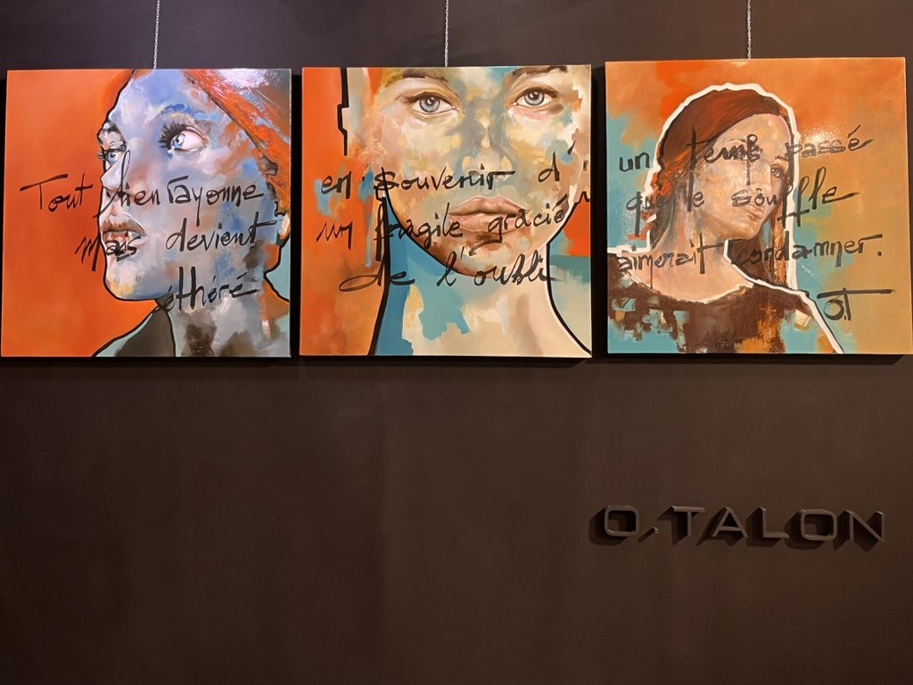 Info de Mars 2024 - Je travaille en 2024 sur la notion de lien et je viens de créer trois portraits sur fond orangés. Certes, ils sont unis par le graphisme et la couleur mais j'y associe un lien supplémentaire : une simple phrase qui parcours les trois tableaux de 100x100cm. La particularité de cette phrase est qu'elle se lit horizontalement mais aussi verticalement. A voir dans l'espace Nouvel VAG du village des antiquaires de la Gare à l'Isle-sur-la-Sorgue jusqu'au 20 avril 2024.