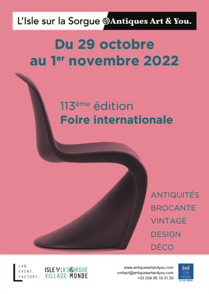Info d'octobre 2022 - A L'isle sur la Sorgue, du 29 Octobre au 1er Novembre 2022, pendant la 113e foire des antiquaires, je serai présent avec une toute nouvelle exposition au Showroom Nouvel VAG de 10h à 17h au premier étage du village des antiquaires de la gare. Ouverture de 10h à 18h. Adresse : 2bis, avenue de l'égalité.