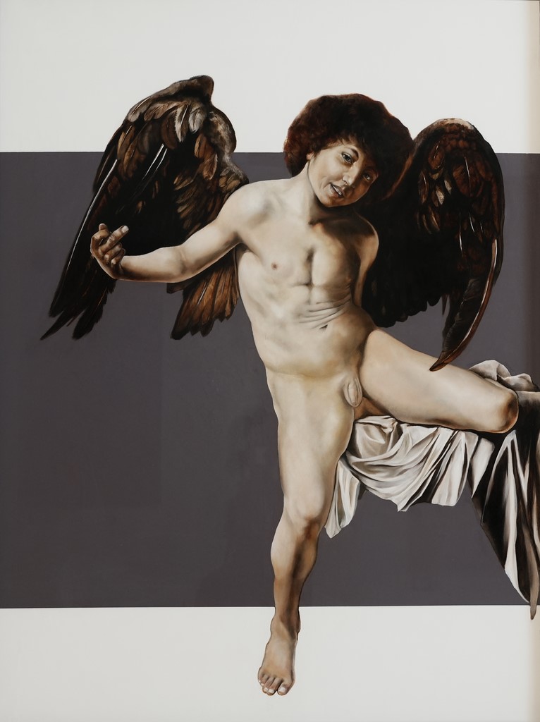 Info d'avril 2023 - Ce cupidon ailé, réalisé en 1601 par Caravage, et copié ici spécialement pour l'exposition "Les anges de la lumière" montre à quel point les temps ont changé. En faisant ce geste irrévérencieux, ce personnage ailé aux traits enfantins dénonce les abus sexuels perpétrés dans l'Eglise et partout ailleurs aussi. Cette dernière, en 2018, a créée une commission indépendante pour faire la lumière sur ces actes. En seulement deux ans, 191 auteurs ont été mis en cause. En octobre 2021, l'épiscopat mandate neuf groupes de travail chargés d'élaborer des propositions concrètes. Leurs conclusions ont été en partie adoptée il y a tout juste quinze jours. Un grand pas vers le pardon. Symbolisme : le violet choisit pour le fond est un violet dit "d'évèque". Le violet est aussi la couleur du repentir.