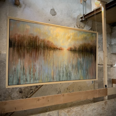 Info de Mai 2024 - En avant première : avant le départ pour Lyon, cette oeuvre composée de 9 panneaux, sera la pièce-maîtresse de l'exposition. Elle dégage une atmosphère et une lumière chaude de fin de journée exceptionnelle.
