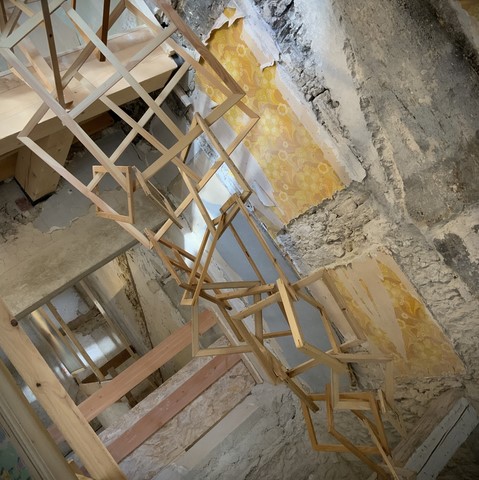Info de Septembre 2024 - Venez visiter l'Hôtel particulier de Brancas, lieu insolite, ouvert spécifiquement pour le festival Partage des arts jusqu'au 15 septembre 2024. Cet hôtel désaffecté situé dans la cour du cinéma a fait l'objet d'une scénographie sonore et visuelle originale. J'y expose trois oeuvres dont cette installation fragile très graphique. A voir absolument...