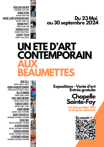 Info de Juin 2024 - Dans le cadre de l'exposition "Un été d'art contemporain" à la Chapelle du village des Beaumettes (à 5 minutes de Gordes), du 27 Juin au 02 Juillet, j'expose avec deux autres artistes incontournables : Bruno POYET (peintre) et François LEGAY (céramiste).