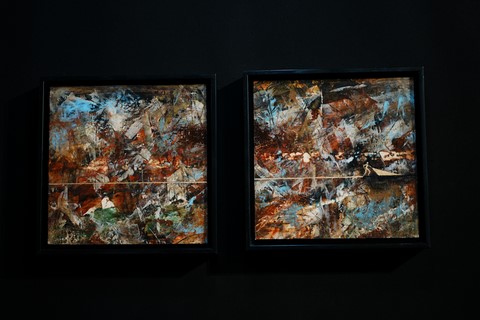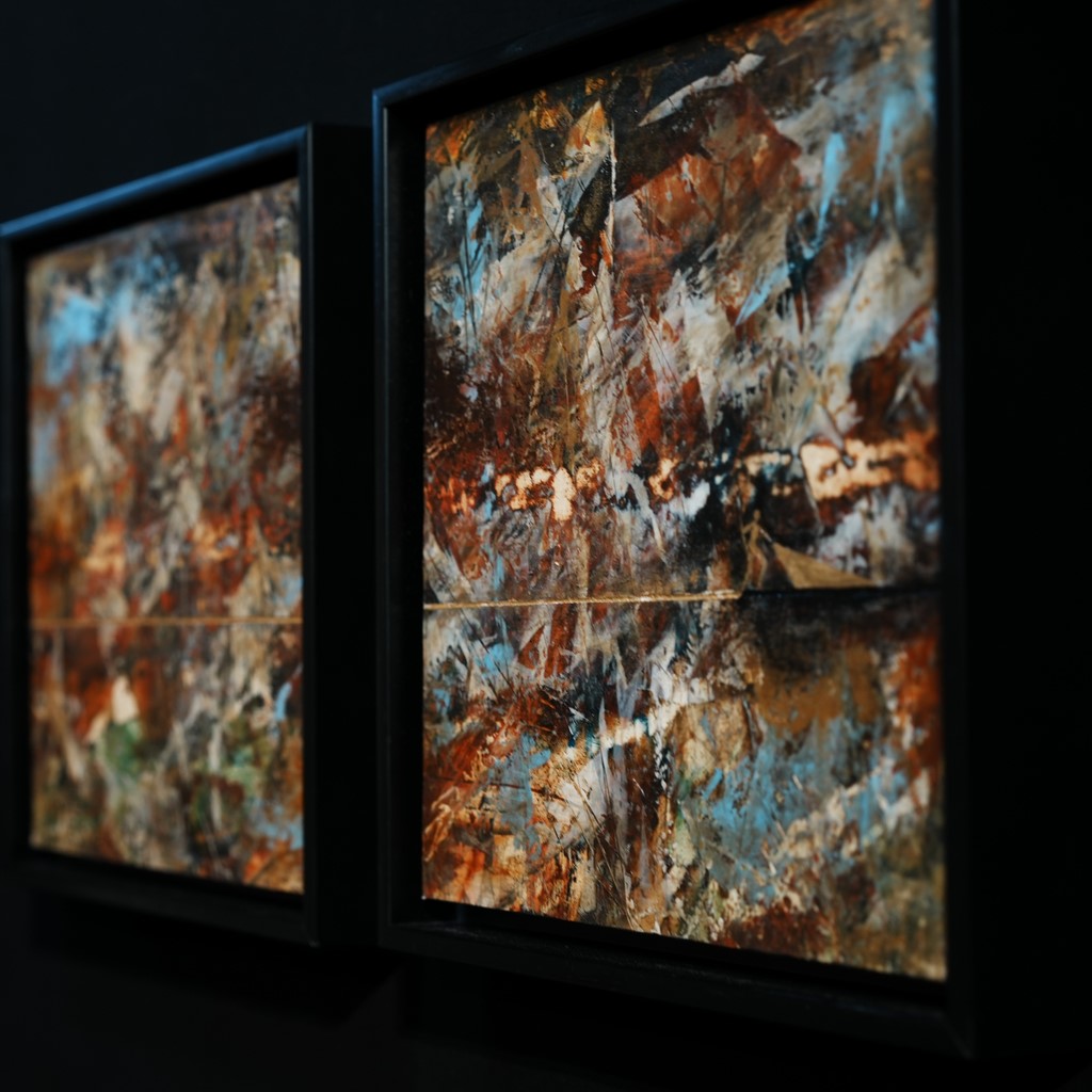 Peinture de la série "Oeuvre fragmentée". Dans cette série, le concept de "lien" est mis en avant. Je fragmente une oeuvre complète en autant de partie nécessaires pour obtenir une harmonie graphique. Cela évoque la symbolique du tout et des parties qui le composent. Je décris cette démarche artistique comme "systémique" car elle nécessite par exemple, dans la conception même de l'oeuvre : l'association d'un thème en lien avec un sujet spécifique, l'utilisation d'un cadrage particulier pour la fragmentation, un encadrement fait sur-mesure, l'implication du collectionneur, une co-construction avec l'espace d'exposition et parfois la relation avec une autre oeuvre. Ainsi, l'oeuvre globale se caractérise par l'union faite de tous les éléments qui la composent.